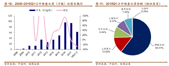 18Q1-3主要生产厂家有(50万批签发以上):天坛系(200.46万,同比+16%)、泰邦系(119.97万,同比-3%)、莱士系(106.51万,同比-9%)、华兰系(83.33万,同比-40%)、远大蜀阳(64.71万,同比-22%)。博雅生物18Q1-3 批签发46.92万瓶,同比+47%,是少数18Q1-3 批签发大幅上升的主要生产企业。