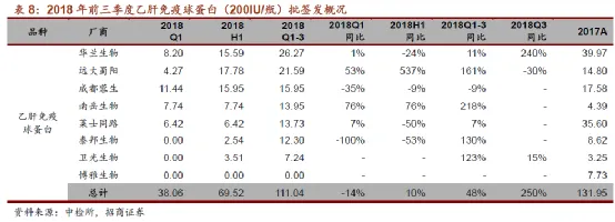 2018Q1-3,乙肝免疫球蛋白(折算成200IU/瓶)批签发111.04万瓶,同比增长48%。主要的批签发企业有上海莱士(同路生物)、华兰生物和天坛生物等。