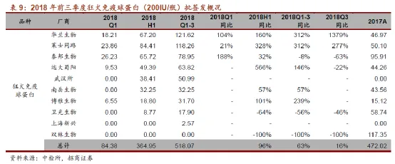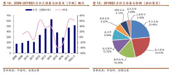 2008年-2014年国内狂犬球蛋白(折算成200IU/瓶)批签量快速增长,CAGR24%,2014年批签量达631.81万瓶。随着国内加强宠物、流浪猫狗管理,再加上狂犬疫苗的冲击,狂犬球蛋白需求出现下滑,批签量回调。2015-2016年批签量大幅下滑。2017年开始狂免批签发开始回升:2017年批签发472.02万瓶,同比增长63%;2018Q1-3批签发518.07万瓶,同比增长63%。