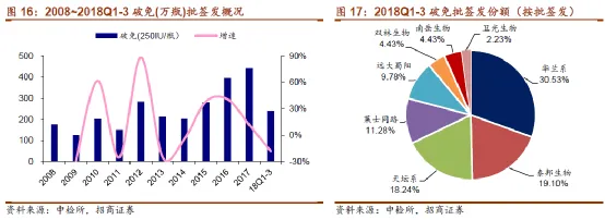 2008-2014年,破免批签发处于小幅波动状态,平均每年批签发193万瓶。2014-2017年破免批签发逐年上升,从2014年的202.98万瓶上升到了2017年的441.76万瓶。但2017 年增速为12%,已经明显放缓。
