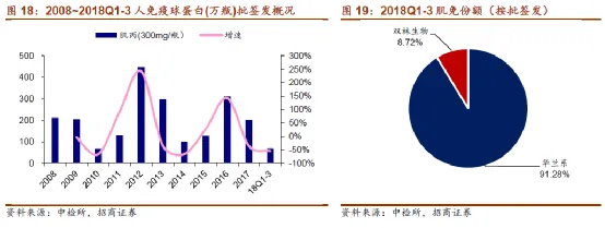 2018Q1-3,肌丙批签发69.06万瓶,同比-55%;只有两家有批签发,其中华兰系63.04万瓶(同比+433%),双林生物(ST 生化)6.02万瓶(17A 没有批签发)。华兰系占比91.28%,处于绝对主导地位。2017年批签排名前三的河北大安、卫光生物、莱士同路18Q1-3没有批签发。