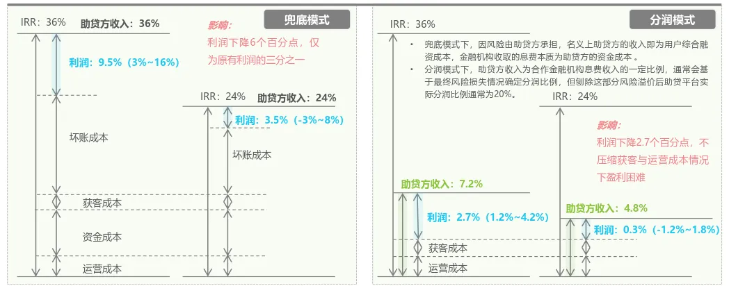 利率调整将引导消费贷用户回归持牌机构,助贷平台不进行兜底的分润模式是最轻的一种业务模式,将成为未来的主流发展模式。相比兜底,分润模式的利润本来就有所降低,在不压缩获客与运营成本的情况下盈利困难。未来的幸存者将是科技能力、运营效率的胜出方,获客成本的优势将成为核心优势。