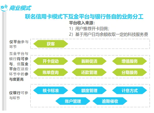 方向4中,目前已有以全国性银行为代表的"品牌联名"合作模式和以区域性银行为带边的"品牌联名+联合运营"模式。互金平台为银行提供用户推荐服务,并与银行联合参与消费促活、账单查询、还款管理等科技服务。