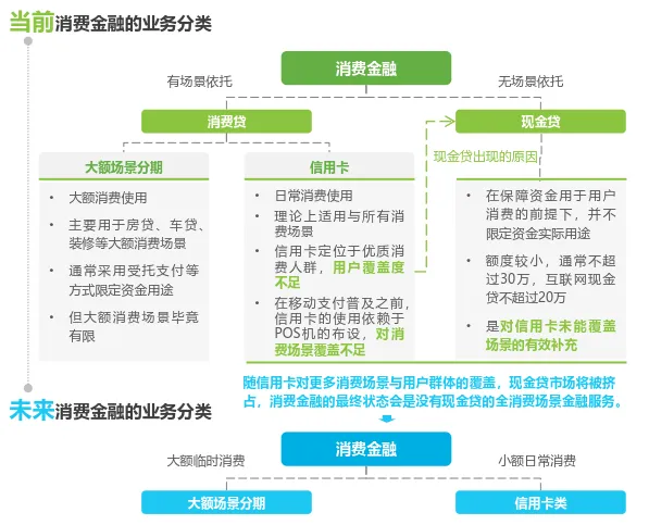 消费金融的本质回归。消费金融的终极状态是没有现金贷的全消费场景金融服务,信用卡与互联网信用支付产品的融合将加速这一进程。消费金融的分类将不再根据是否有场景依托,而是在全部有场景依托前提下针对借贷额度的分类。