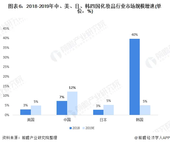 与美国、日本、韩国化妆品行业市场规模增速相比,近两年来我国化妆品行业市场规模增长迅速且较为稳定,2018年除了韩国之外,我国市场规模增速为7%,高于美国、日本增速4个百分点。