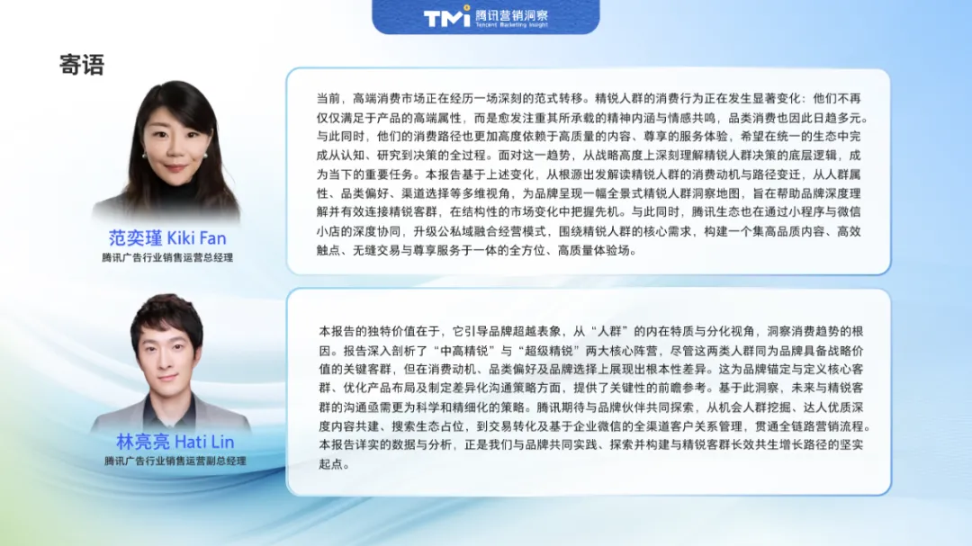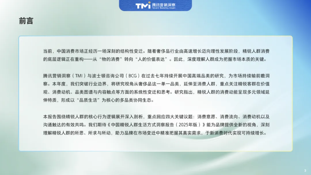 中国高端消费市场正经历深刻变化,精锐人群的消费行为呈现出从物质追求向精神价值表达的转变。他们不再仅关注产品本身,更重视其背后的文化意义与情感连接,消费选择日益多样化。在决策过程中,他们依赖高质量内容和个性化服务,期望在一个统一生态中完成从认知到购买的全过程。精锐人群可划分为“中高精锐”与“超级精锐”,两者虽同为重要客群,但在消费动机、品类偏好及品牌选择上存在显著差异。这一分化为品牌提供了精准定位与策略制定的重要依据。品牌需以更科学的方式理解并触达这些群体,提升沟通效率与转化效果。Z世代超级精锐正在成为新的消费趋势引领者,他们注重独立价值观与多元化选择,推动高端市场格局不断演变。奢侈品仍是身份象征,但高端旅游、文化娱乐及智能科技等新兴领域增长迅速,反映出消费者生活半径的扩展与精神需求的升级。报告通过定量调研与定性访谈相结合的方式,覆盖15个细分高端生活方式品类,深入分析精锐人群的价值观、消费动机、品类图谱及内容触点的变化。研究强调,品牌应强化精神内核,优化互动形式,合理布局线上内容与交易路径,以持续赢得消费者的信任与共鸣。