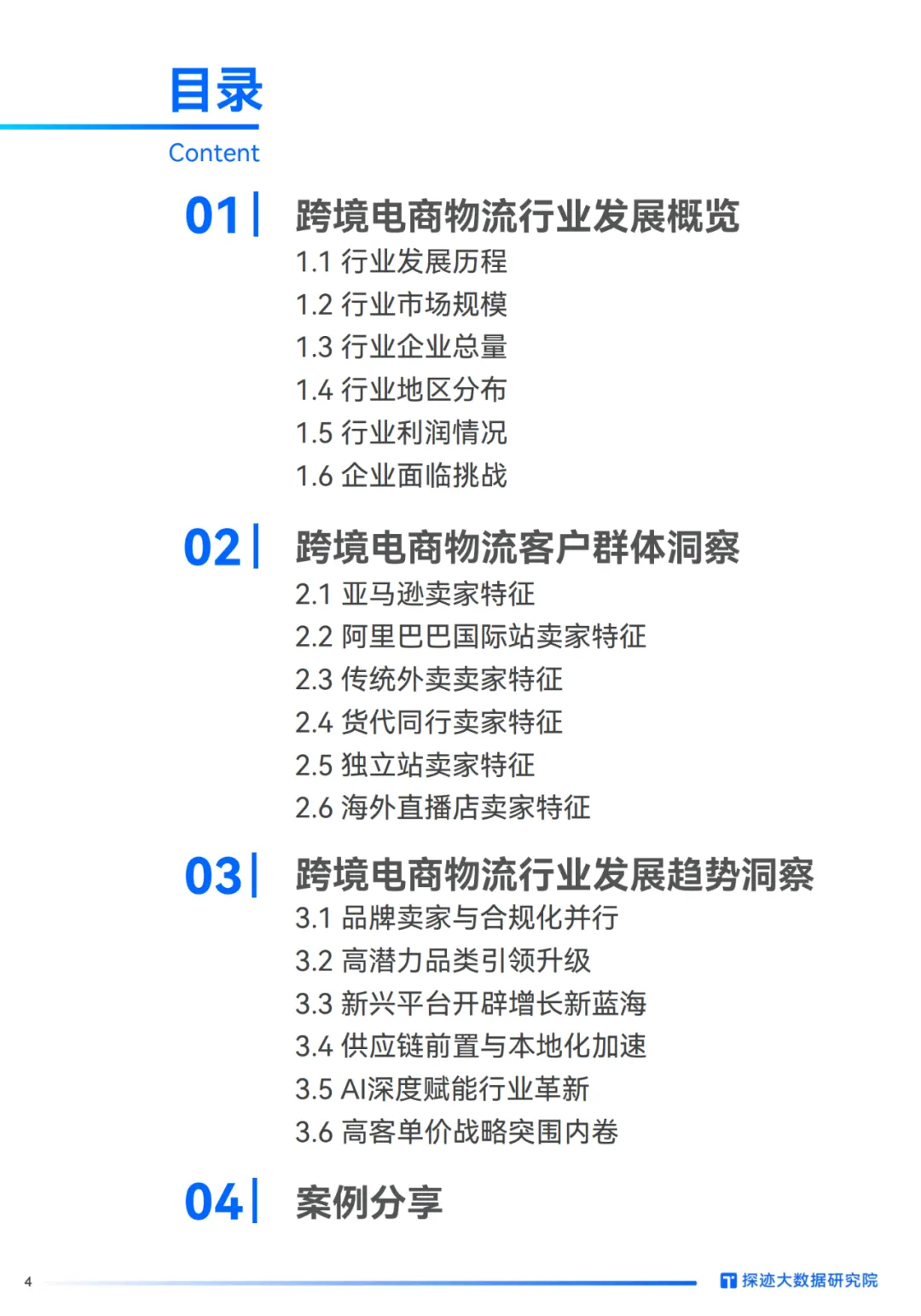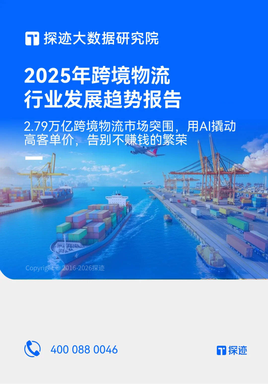 这份由探迹科技发布的《2025 年跨境物流行业发展趋势报告》,核心聚焦行业从 “规模扩张” 转向 “效率与价值竞争” 的转型,强调 AI 与数字化是破局关键,全文可简单总结为四大模块: