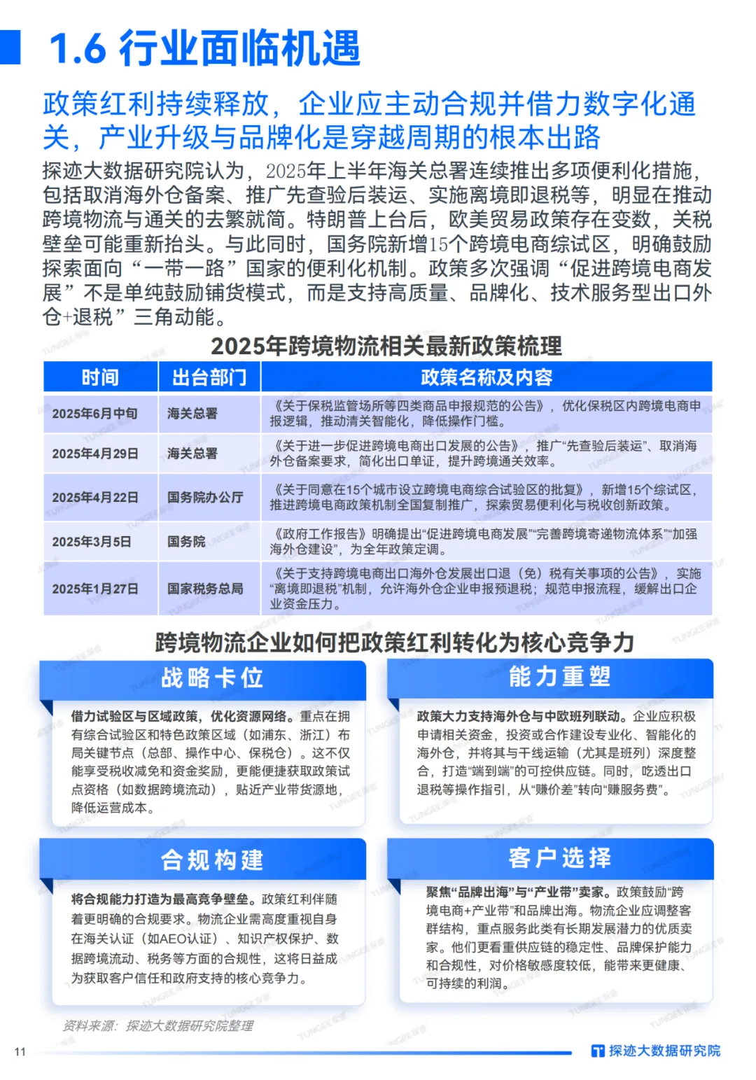 市场规模:2025 年跨境物流市场规模预计达 2.79 万亿元,跨境电商规模突破 18 万亿元,增速高于外贸整体,但需应对中美合规收紧(如美国取消 800 美元以下小包免税)。
