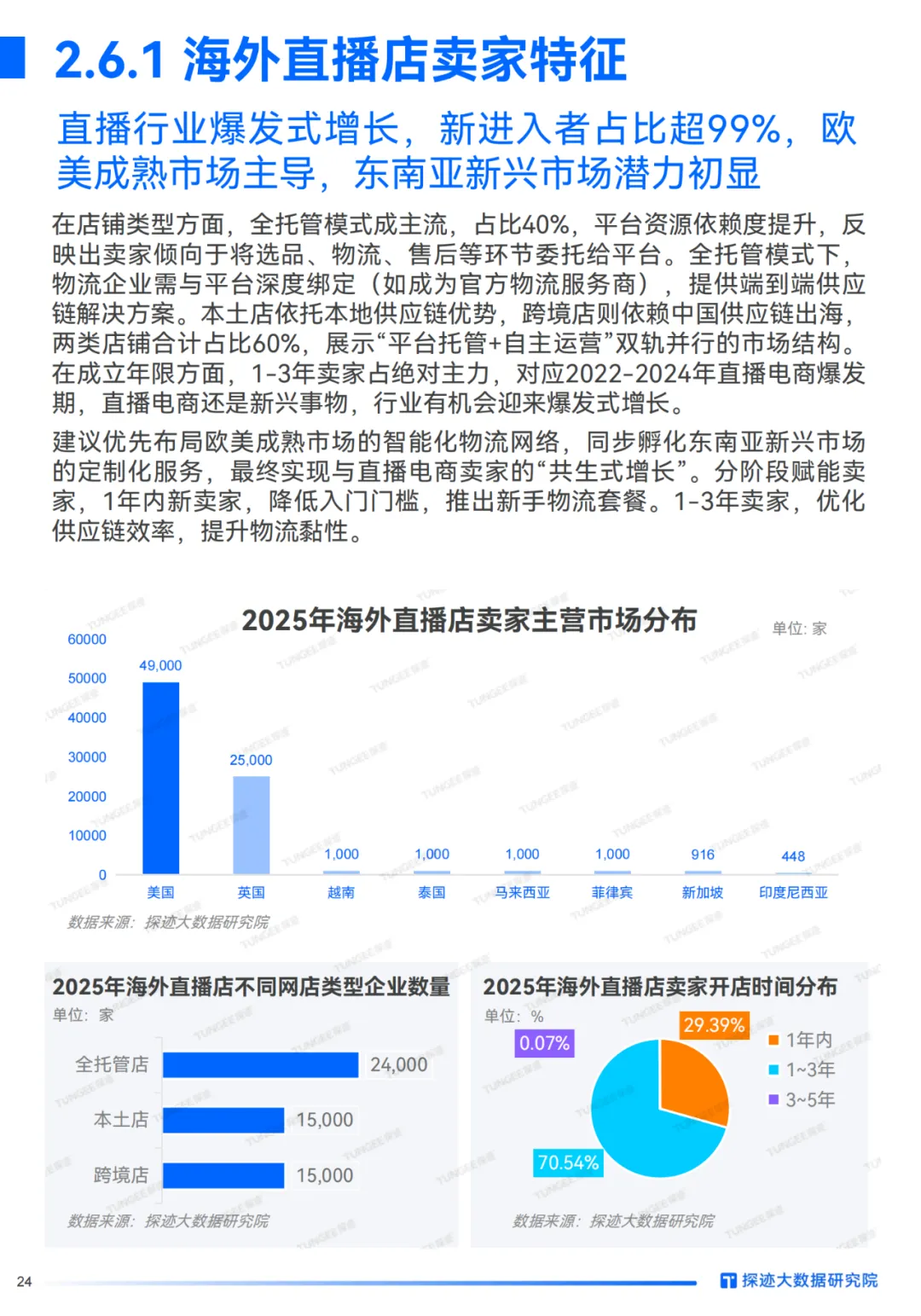 独立站 / 海外直播店卖家:独立站卖家以欧美高收入市场为主(占比超 85%),单票货值高、毛利高;海外直播店新进入者超 99%,全托管模式占 40%,家居、3C 是 TOP 类目,需弹性供应链支持。