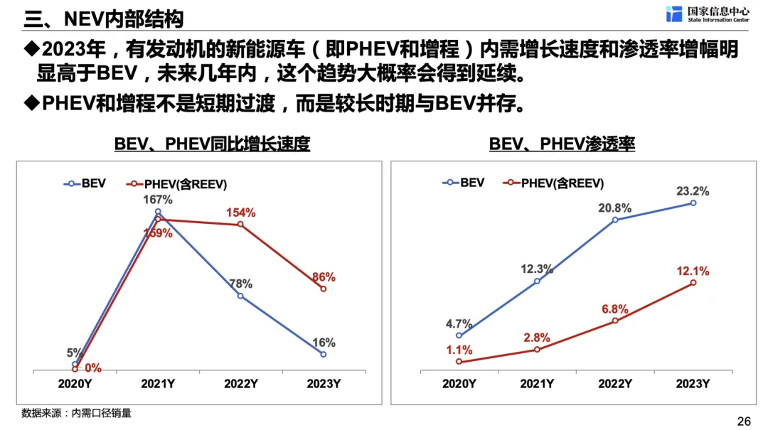 下图中红色曲线是PHEV(含增程)的增长率,2023年为86%,BEV增长16。右图为渗透率,BEV增长相对放缓,而PHEV从2022年的6.8%上升到了2023年的12.1%,增速较快。
