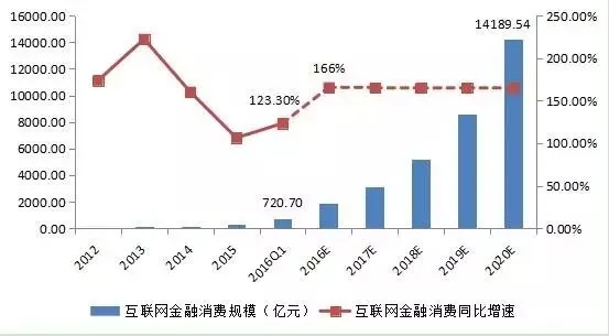 2015年我国互联网消费金融市场交易规模达到322.8亿元,而到2016年前一季度,交易规模已达到720.7亿元,增速高达123.3%。整体看2016年市场规模突破千亿已无悬念,未来三年复合增长率将超过100%,预计2020年规模将达到1.4万亿元,互联网消费金融将成为下一个风口。