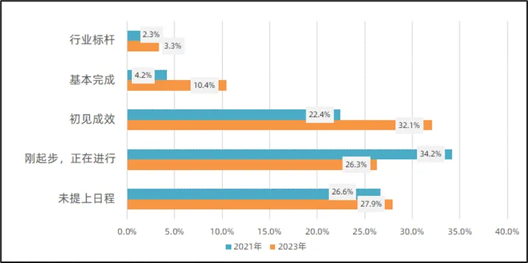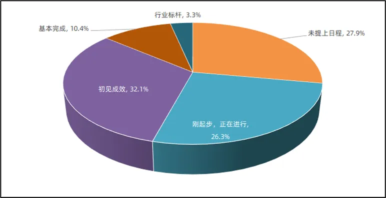 如图3所示,72%的企业已开始数字化转型升级,28%的企业认为自己尚未开始积极投入,与2021年数据基本持平。其中,占比14%的企业认为基本实现供应链全过程的数字化运营,32.1%认为数字化发展初见成效,较去年均有一定幅度的提升,如图4。