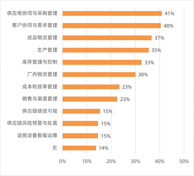 调研结论:供应商布局规划与管理、物流效率优化、设计变更(工艺、物料等)与供应链的协同、订单交付管理以及入厂物流管理等是制造企业当前供应链改善的重要关注点。