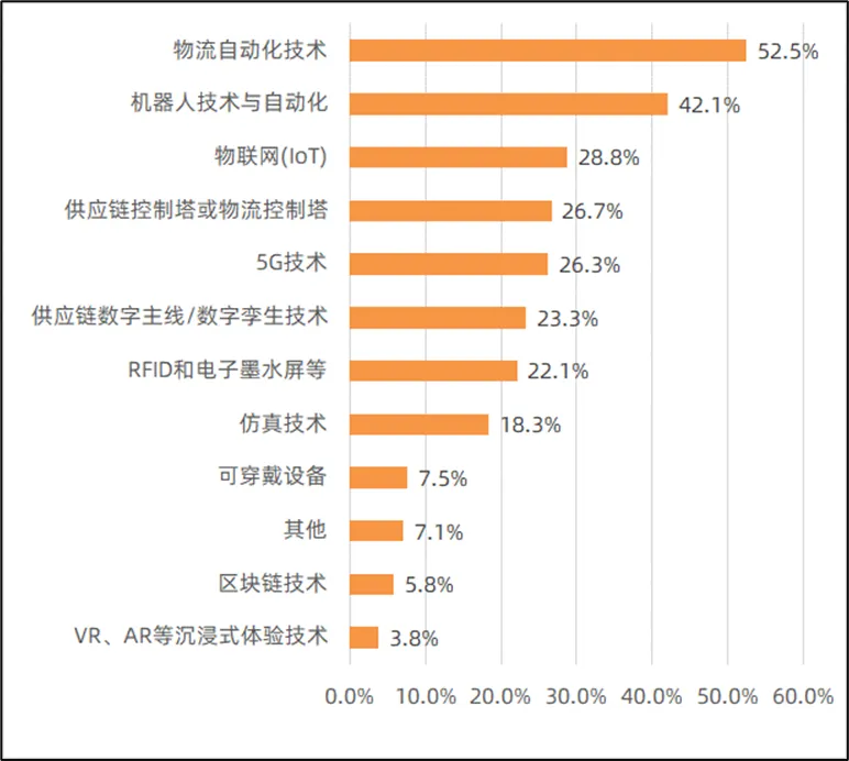 如图9所示,约50%的企业采用了智能立库、AGV、智能拣选、机器人等自动化技术,同时也有接近1/3的企业采用了物联网、供应链或物流控制塔、5G技术等应用。