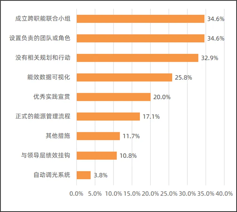 如图10所示,有35%的企业成立了跨职能的联合小组,有35%的企业专门设置了负责的团队或角色,有26%的企业实现了能效数据可视化管理,但仅有33%的企业没有相关的规划和行动。