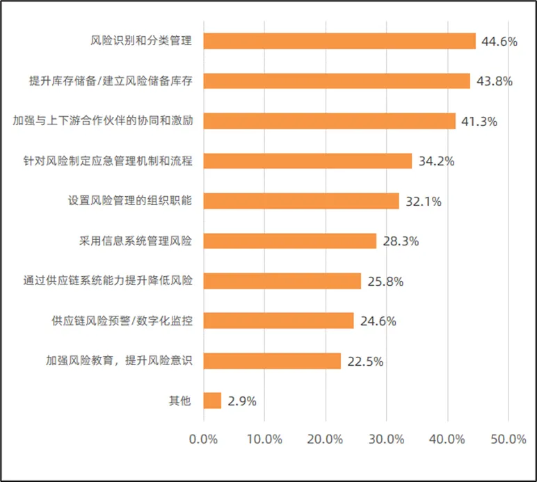 调研结论:制造企业在供应链风险管理上采取的措施主要包括对供应链风险进行风险识别和分类管理、建立风险储备库存、加强与上下游合作伙伴的协同和激励、针对风险制定应急管理机制和流程等。