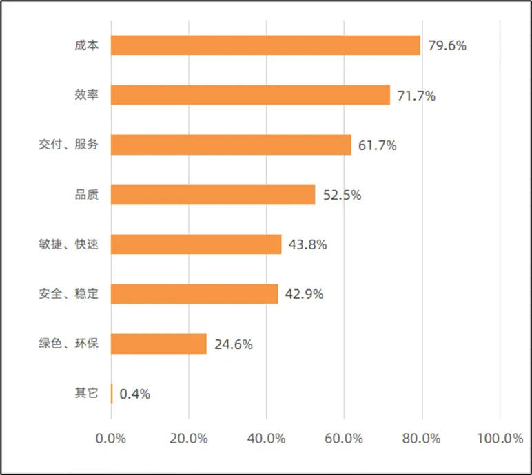 调研结论:无论供应链理念和技术如何迭代、环境如何变化,制造企业供应链规划、优化和新技术应用等的本质目标依然是以成本、效率、交付(服务)为主。