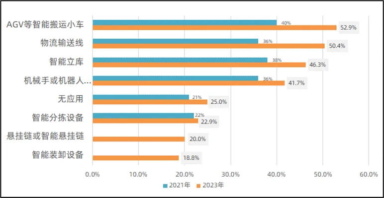 如图17、图18所示,AGV智能搬运小车、物流输送线、智能立库、物流机械手或机器人等已经成为制造企业工厂中较为普及的应用,相对2021年调研数据,这些智能物流设施在企业中的应用占比都有较大程度的提升。