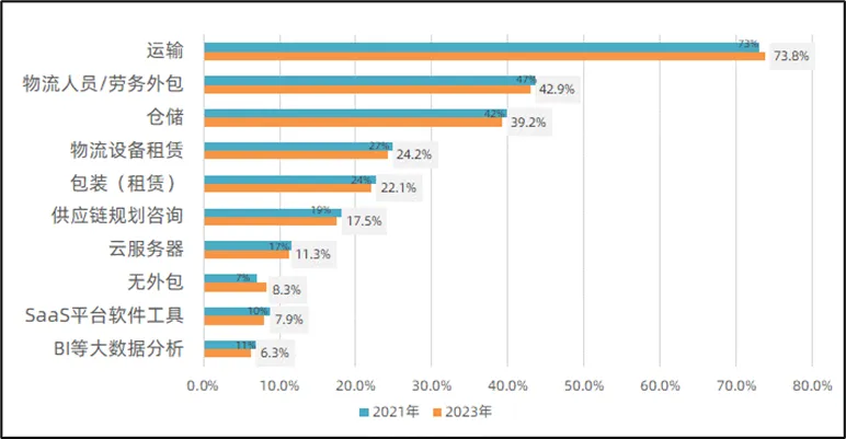 如图21、图22所示,运输、仓储、劳务外包仍是供应链服务外包的主流项目,各个服务项目外包的数据和2021、2020年也基本持平。