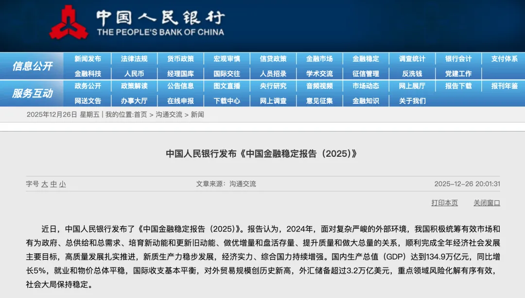 12月26日,中国人民银行发布了《中国金融稳定报告(2025)》。