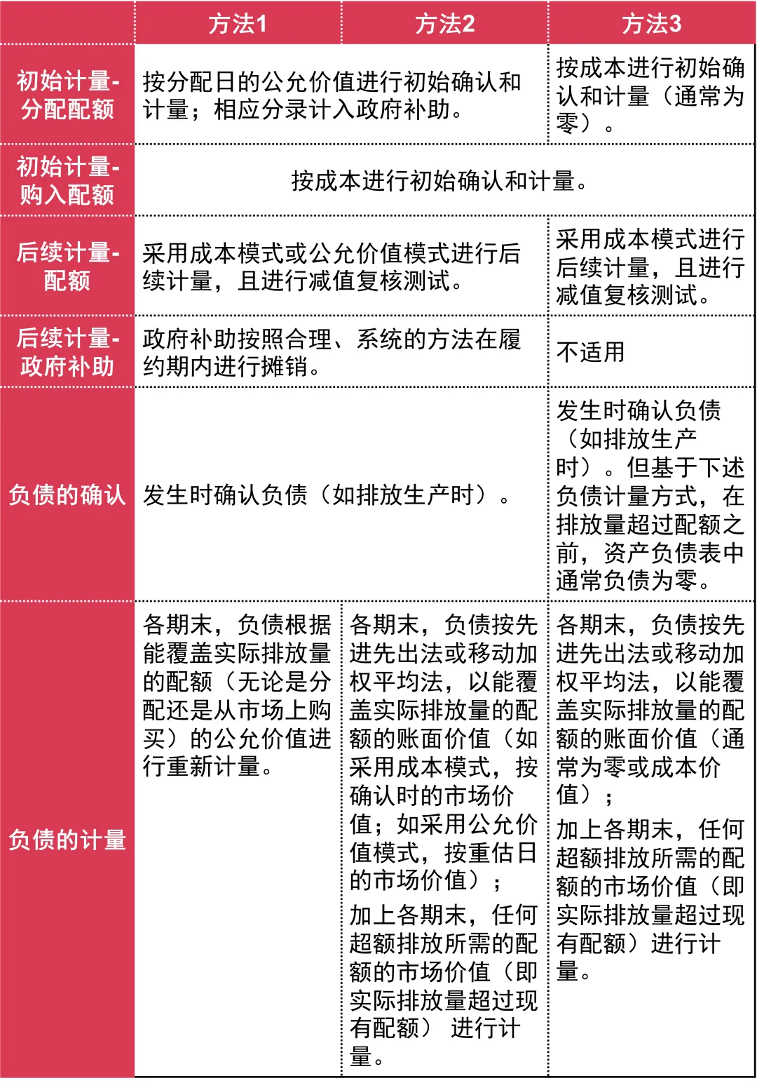 方法1属于完全市场价值法,参考的是已在2005年6月,因国际会计准则理事会考虑到相关准则不协调等原因而被撤销的《国际财务报告解释公告第3号》,方法2和方法3,通常被称为“基于初始市场价值的成本结算法”和“基于名义金额的成本结算法”,但方法3只对购买的配额确认资产,不确认收益;且只有当排放量超过被分配配额时,才确认负债和费用。