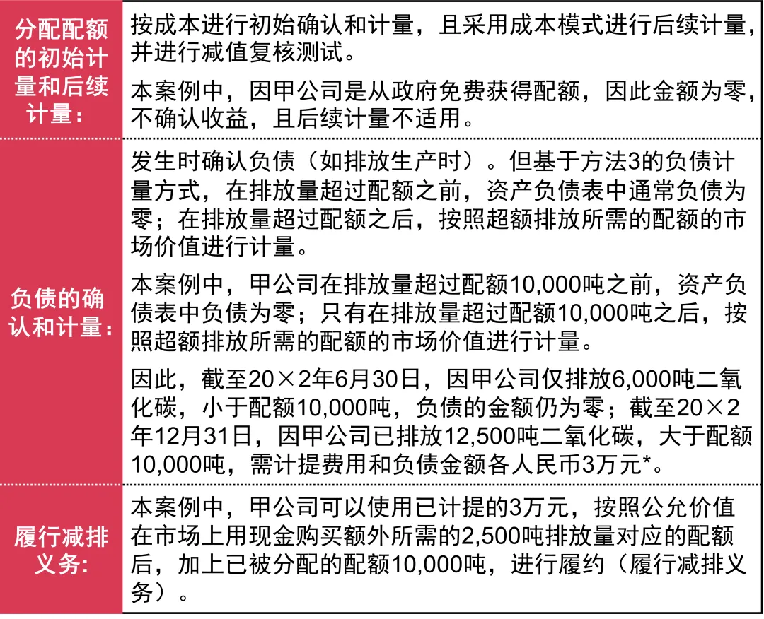 因此,20×2年,在国际财务报告准则的方法3 - “基于名义金额的成本结算法”下,甲公司仅在其超额排放后,需确认和碳排放负债相关的3万元损失。