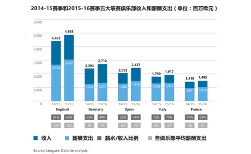 英超:英超球员薪金支出增加到了30亿欧元,比五大联赛中任何一个其他的联赛的球员薪金支出的两倍还多。