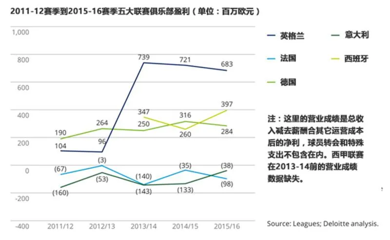 英超:英超各俱乐部整体营业利润略有下滑,总额为6.83亿欧元。出现下降的原因是,为了招来更多优秀球员而上涨薪酬支出。不过令人惊讶的是,英超20家俱乐部中,有17家实现了盈利。据德勤预计,在2016-17赛季英超有机会实现20家俱乐部全部盈利的情况。