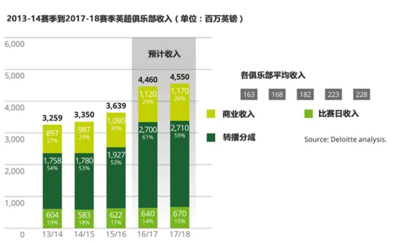 在未来两个赛季,英超联赛将延续增长的势头。2016-17赛季将是天价转播周期的首个赛季,转播分成将比这个赛季提高46%,达到惊人的24亿英镑;商业收入方面,类似切尔西与耐克签下高额赞助合同的事情会源源不断;搬入新球场的西汉姆、热刺及翻新主场的利物浦也会提升比赛日的收入。根据德勤的预计,英超2016-17赛季总收入将达到45亿英镑、2017-18赛季为46亿英镑。