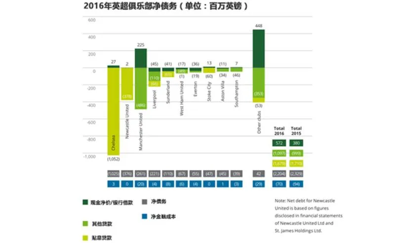 2015-16赛季后,英超各俱乐部净负债总额为22亿英镑,比前一个赛季减少了1.25亿欧元,连续三个赛季实现了减少负债。