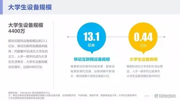 移动互联网设备规模达到13.1亿台,移动互联网发展越来越快;而随着95后成为大学生的主力,人手一部手机成为大学生生活常态,大学生设备规模也在增长,达到4400万台。