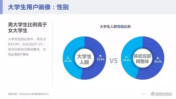 大学生性别比例中,男生占比52.8%,女生占比47.2%;但对比移动互联网整体,女性比例高于整体。
