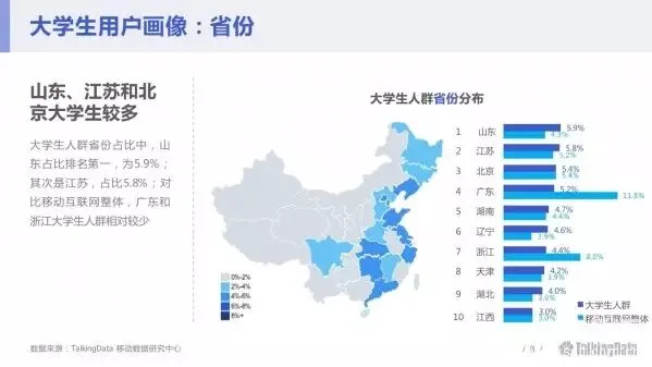 大学生人群省份占比中,山东占比排名第一,为5.9%;其次是江苏,占比5.8%;对比移动互联网整体,广东和浙江大学生人群相对较少。