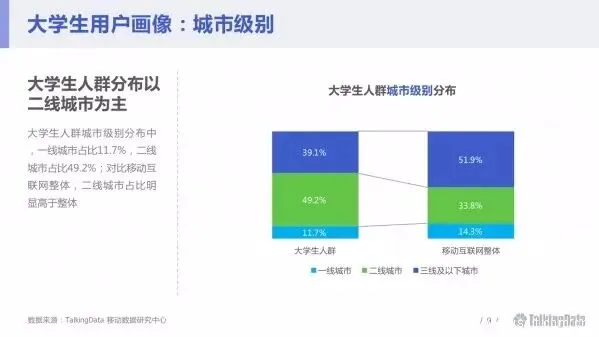 大学生人群城市级别分布中,一线城市占比11.7%,二线城市占比49.2%;对比移动互联网整体,二线城市占比明显高于整体。