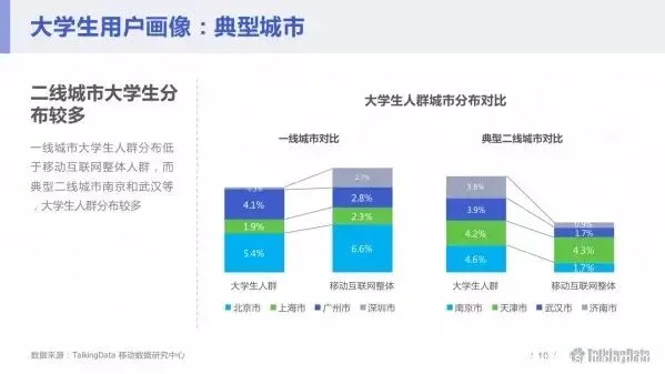 一线城市大学生人群分布低于移动互联网整体人群,而典型二线城市南京和武汉等,大学生人群分布较多。