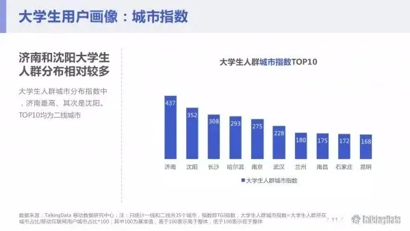 大学生人群城市分布指数中,济南最高、其次是沈阳。TOP10均为二线城市。