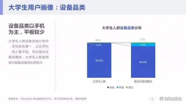 大学生人群设备品类分布中,手机排名第一,占比99%,有少量平板。对比移动互联网整体,大学生人群使用其它智能设备的比例较少。
