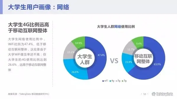 大学生网络使用比例中,WiFi比例为47.4%、低于移动互联网整体,这应是由于大学WiFi普及率还不高;但大学生的4G 使用比例达到26.6%,远高于移动互联网整体。
