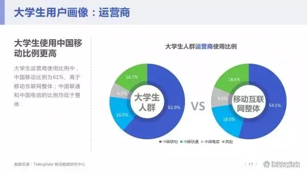 大学生运营商使用比例中,中国移动比例为61%、高于移动互联网整体;中国联通和中国电信的比例均低于整体。
