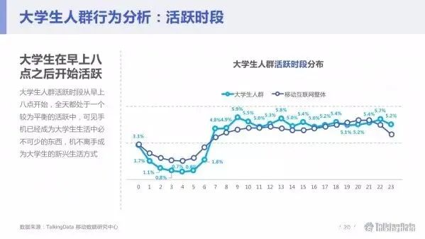 大学生人群活跃时段从早上八点开始,全天都处于一个较为平衡的活跃中,可见手机已经成为大学生生活中必不可少的东西,机不离手成为大学生的新兴生活方式。