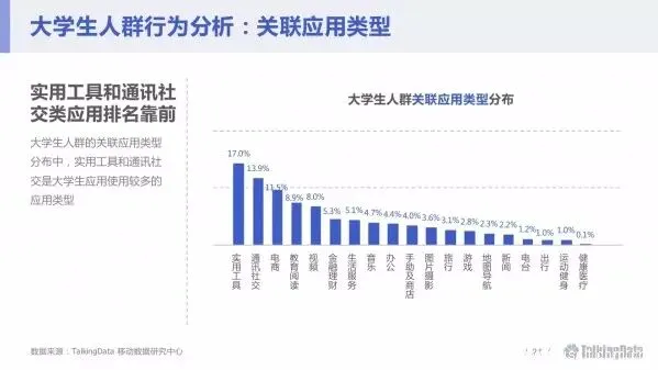 大学生人群的关联应用类型分布中,实用工具和通讯社交是大学生应用使用较多的应用类型。