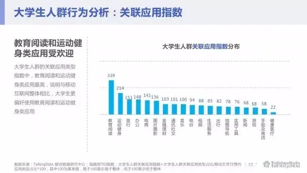 大学生人群的关联应用类型指数中,教育阅读和运动健身类应用最高,说明与移动互联网整体相比,大学生更偏好使用教育阅读和运动健身类应用。