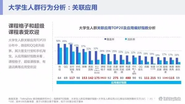 大学生人群关联应用TOP20分布中,微信和QQ名列前茅。其次是支付宝和手机淘宝。从应用偏好指数来看,课程格子、超级课程表、有道词典等应用受欢迎。
