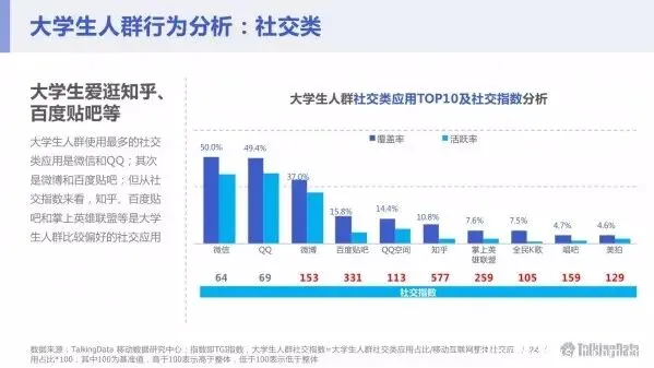 大学生人群使用最多的社交类应用是微信和QQ;其次是微博和百度贴吧;但从社交指数来看,知乎、百度贴吧和掌上英雄联盟等是大学生人群比较偏好的社交应用。