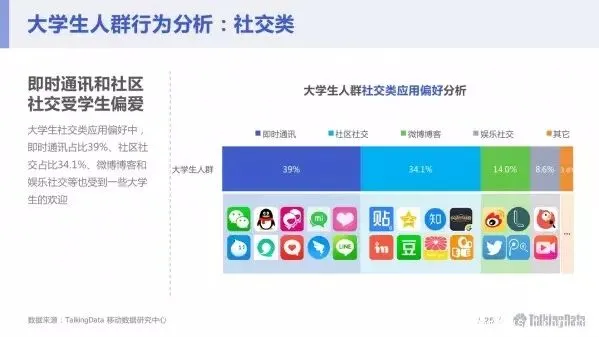 大学生社交类应用偏好中,即时通讯占比39%、社区社交占比34.1%、微博博客和娱乐社交等也受到一些大学生的欢迎。