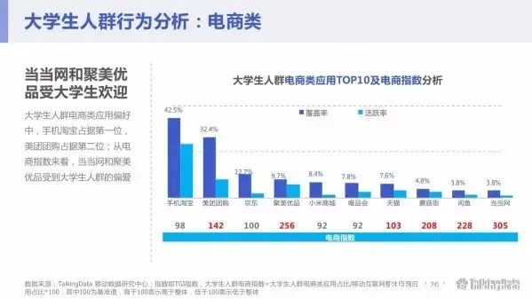 大学生人群电商类应用偏好中,手机淘宝占据第一位,美团团购占据第二位;从电商指数来看,当当网和聚美优品受到大学生人群的偏爱。