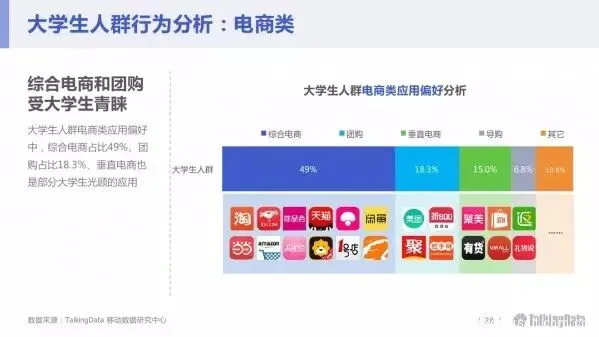 大学生人群电商类应用偏好中,综合电商占比49%、团购占比18.3%、垂直电商也是部分大学生光顾的应用。
