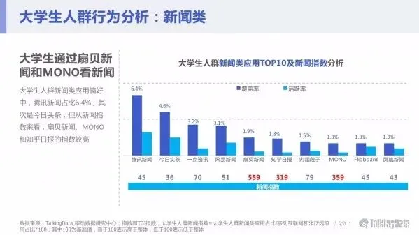 大学生人群新闻类应用偏好中,腾讯新闻占比6.4%、其次是今日头条;但从新闻指数来看,扇贝新闻、MONO和知乎日报的指数较高。