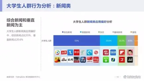 大学生人群新闻类应用偏好中,综合新闻占比55%、垂直新闻占20.6%。