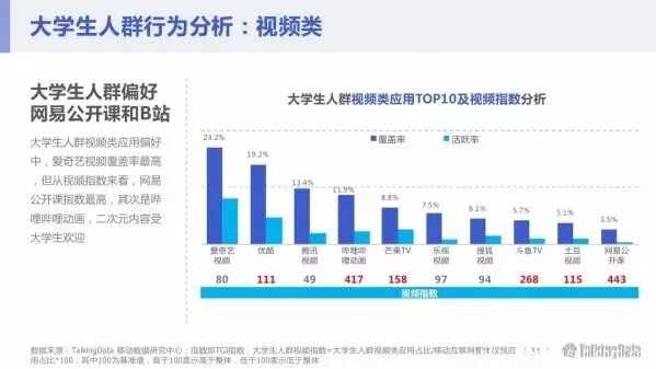 大学生人群视频类应用偏好中,爱奇艺视频覆盖率最高,但从视频指数来看,网易公开课指数最高,其次是哔哩哔哩动画,二次元内容受大学生欢迎。